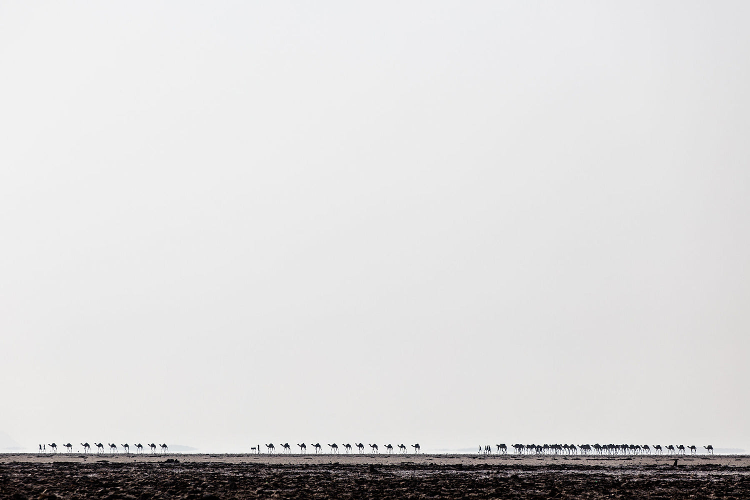 A caravan of salt workers and their camels walk across the desolate landscape of Ethiopia's Danakil Depression, one of the hottest places on Earth.