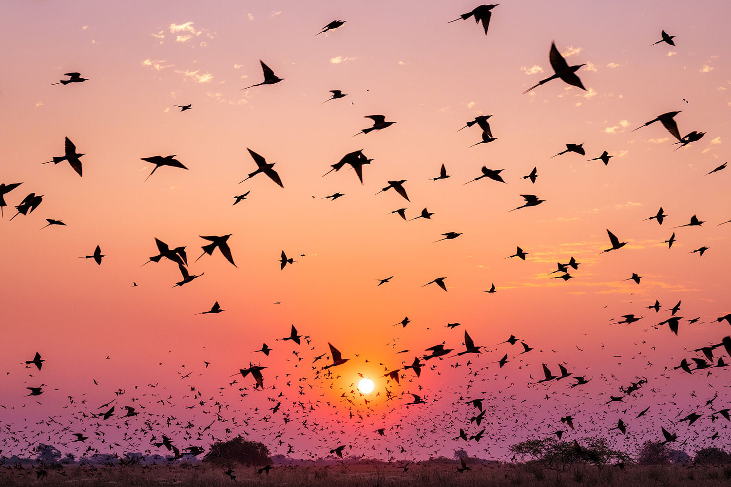 Thousands of carmine bee-eaters take flight at sunset in Namibia's Caprivi Strip - perhaps the most spectacular wildlife experience of my life.
